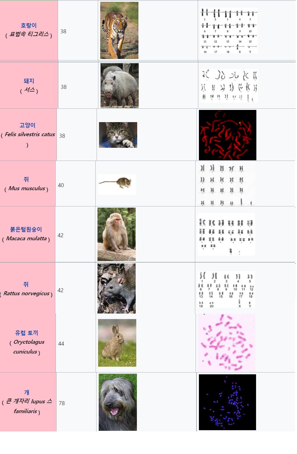 염색체 수에 의해 생물의 목록에 대해 설명 배수성 또는 숫자 염색체에서 세포 각종의 식물, 동물, 원생생물 그리고 다른 살아있는 유기체. 이 번호는 염색체의 외관과 핵형 및 관통 염색체를 보고 확인할 수 있다. 길이, 중심체의 위치, 밴딩 패턴, 성염색체 간의 차이에 주의를 기울인다. 기타 물리적 특성 핵형의 준비와 연구는 세포 유전학의 일부이다.